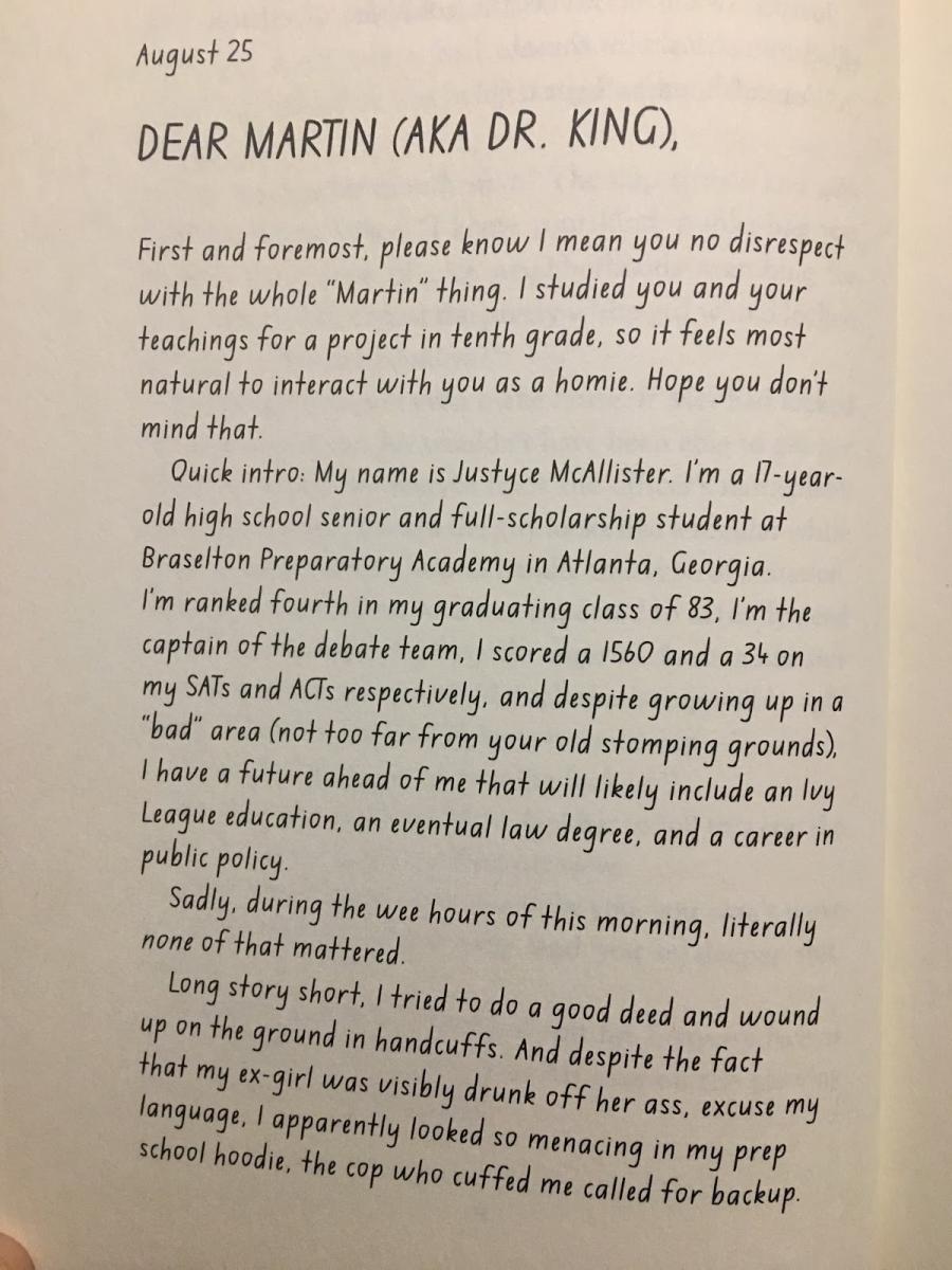 The book tells the story of Justyce, a Yale-bound high school senior who in the opening chapter is brutally and wrongfully handcuffed by a police officer. Justyce faces many thoughts and questions about race and racism and embarks on a personal project—to live like Martin Luther King Jr. As part of this project, he writes letters to MLK (like the one below), which are interspersed throughout the novel.