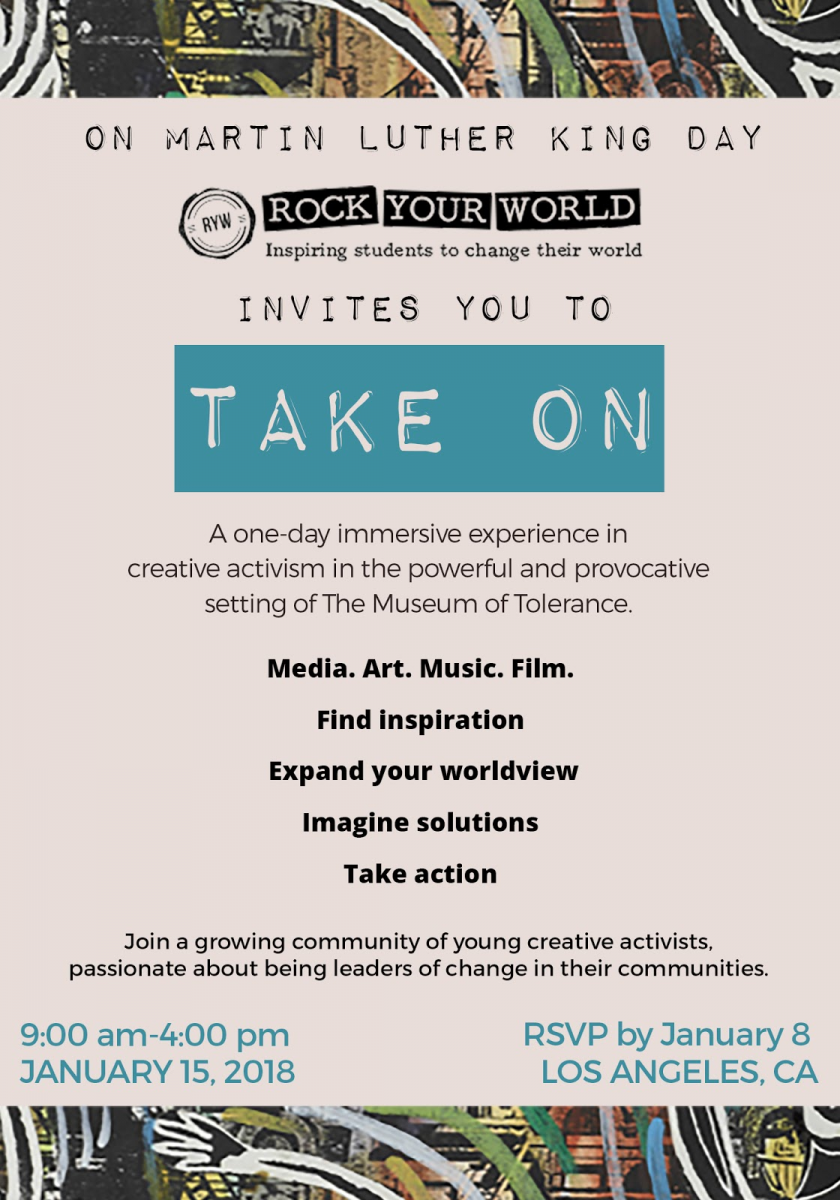 Our next post, featuring student contributors, will focus on taking action about issues that matter using various mediums. Students who attend the Rock Your World TAKE ON Youth Summit at the Museum of Tolerance in Los Angeles will report back on the process of identifying an issue of concern and formulating a creative plan of action to create awareness, and they’ll share their thoughts on how this process is deeply empowering.