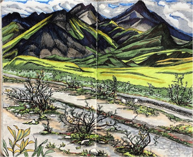 I was invited to Alaska for the first time in 2015 by friends who were launching an adventure tourism company in Juneau. I led painting tours with Adventure Flow. We’d take guests out to a remote beach where I’d help them paint their incredible surroundings. Three months turned into six months, and I was completely taken by Alaska. I ended my stay that year with an art exhibition at the Juneau Arts and Humanities Council, and a burning passion for wild land. I returned the following summer to illustrate three children’s books with Sealaska Heritage, an Alaska Native organization. I also traveled as an artist in residence with the U.S. Fish and Wildlife Service (USFWS) in the Arctic National Wildlife Refuge. We backcountry camped in the refuge and celebrated with the Gwich’in during the Alaska Natives’ biennial Gathering in Arctic Village. I drew portraits and listened to the stories of elders, and created a final artwork that described the intricate and inextricable connection between the people and the Arctic land, used by USFWS for education, inspiration and native relations. I have continued to travel and create as a resident artist with USFWS, visiting the Arctic Coast and Inupiaq village Kaktovik, and the Yukon Delta National Wildlife Refuge, the land of the Yup’ik Eskimos. This summer, I’ll return to document the Yukon Flats National Wildlife Refuge and exhibit my art at the Canvas [an inclusive arts community] in Juneau. I have been completely humbled by my experiences in Alaska—the wild land, the generosity of the people. Its influence permeates everything I create.