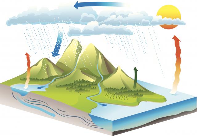 Develop a model to describe the cycling of water through Earth's systems driven by energy from the sun and the force of gravity.
